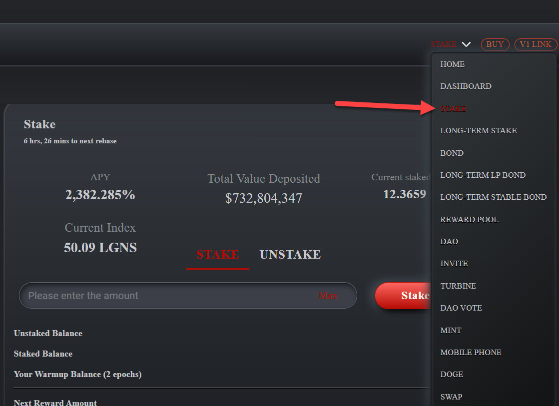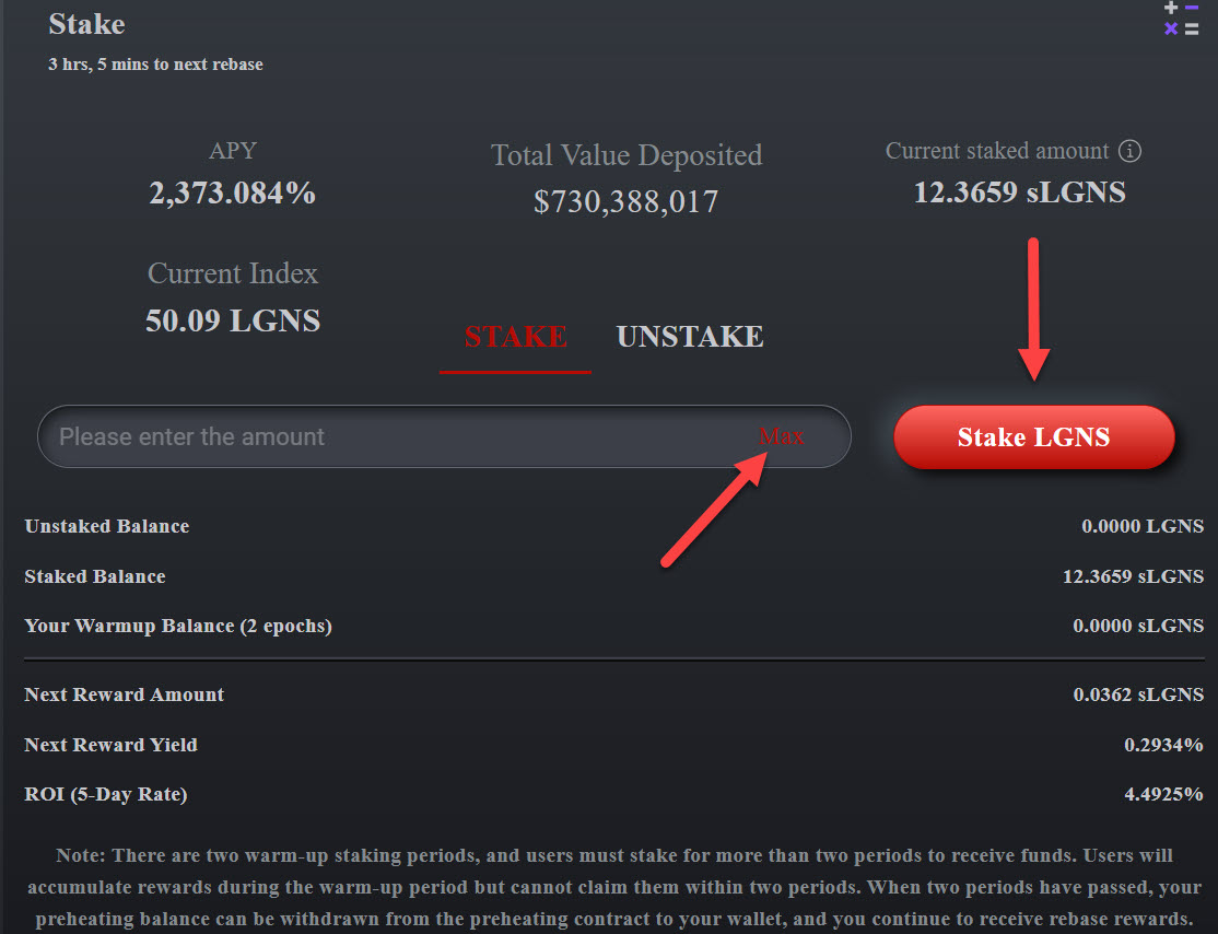 Then click MAX to add all your LGNS to the staking. Then click Stake LGNS